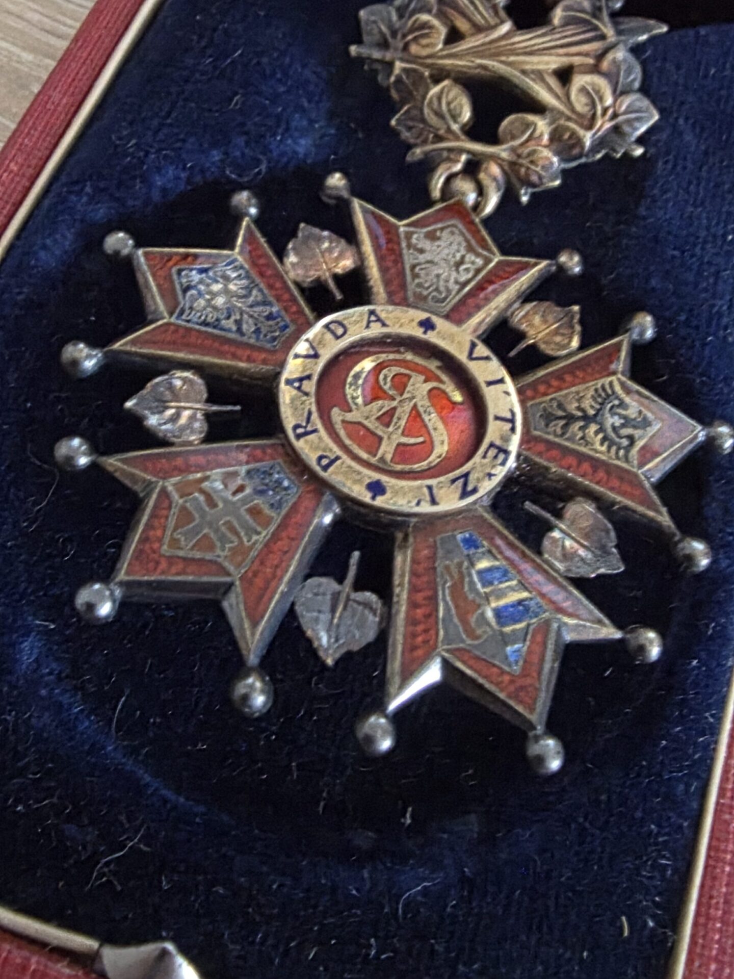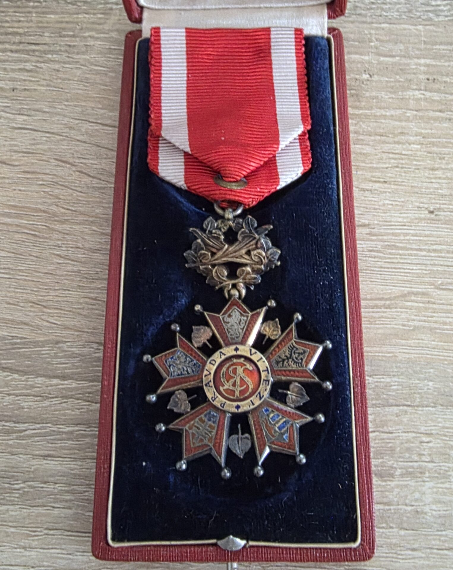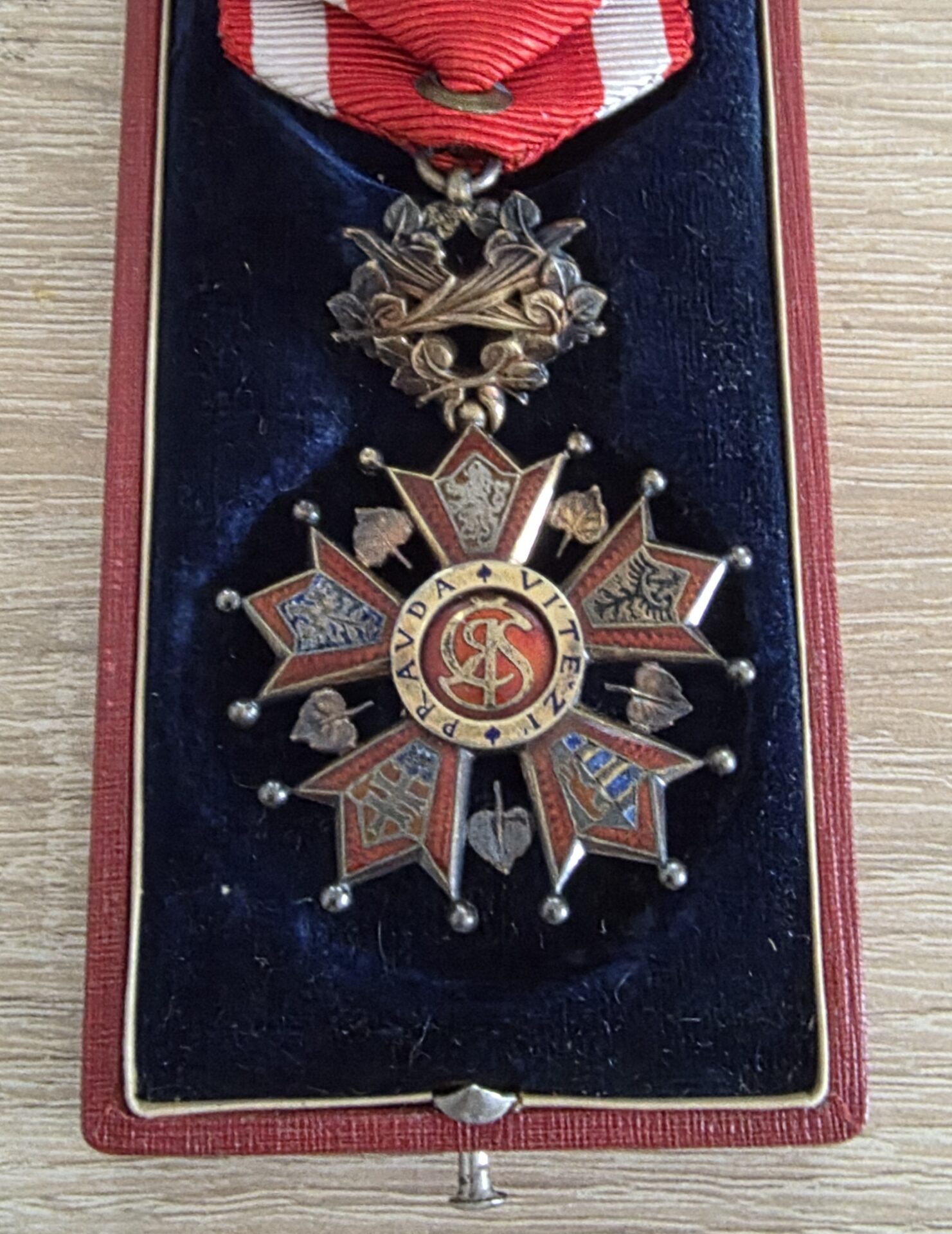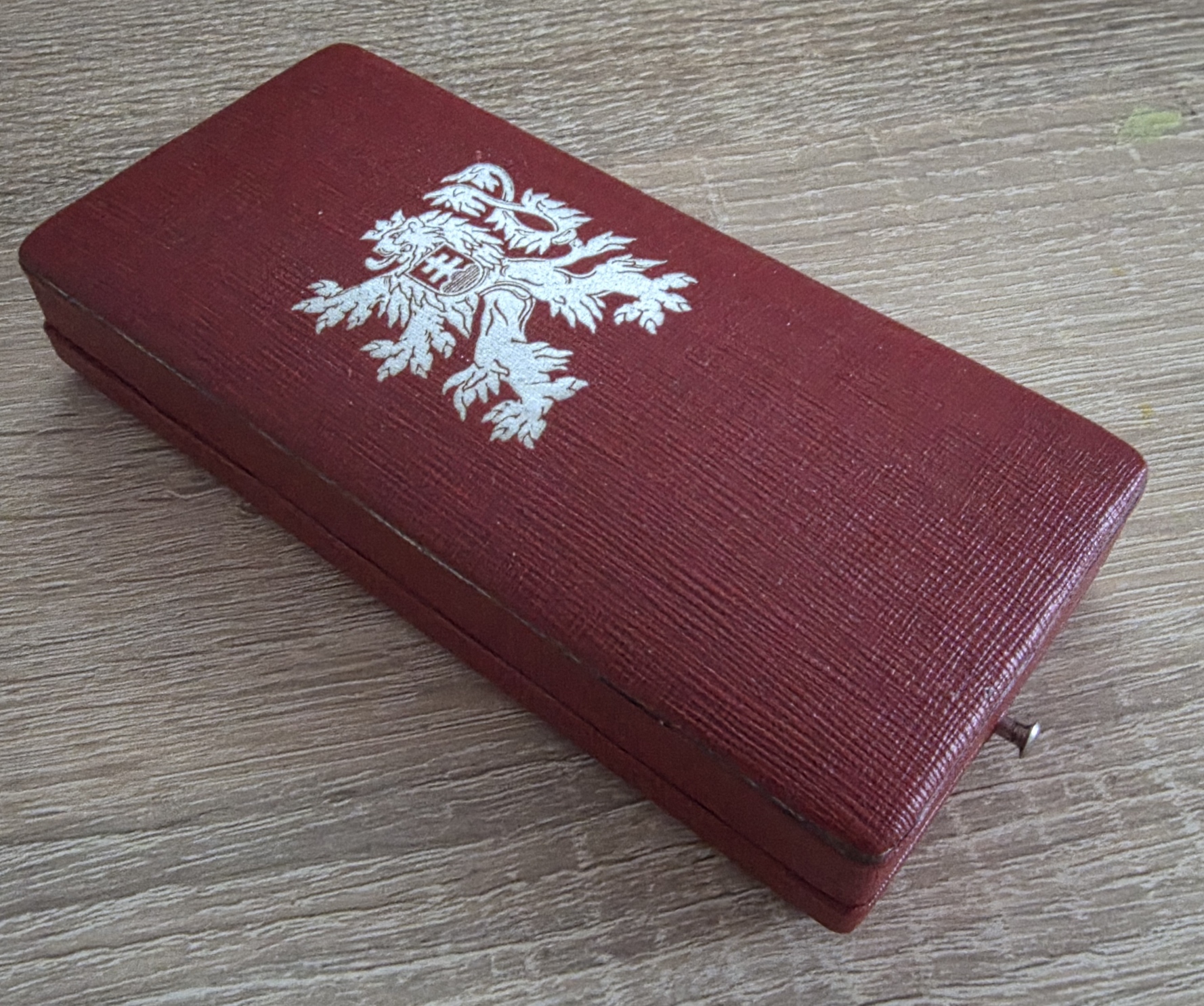 Součástí je také originální dobová etue, přesně odpovídající tomuto řádu – na víku zdobené motivem lva. Etue je původní, plně funkční (spolehlivě se uzavírá), ve velmi pěkném stavu.