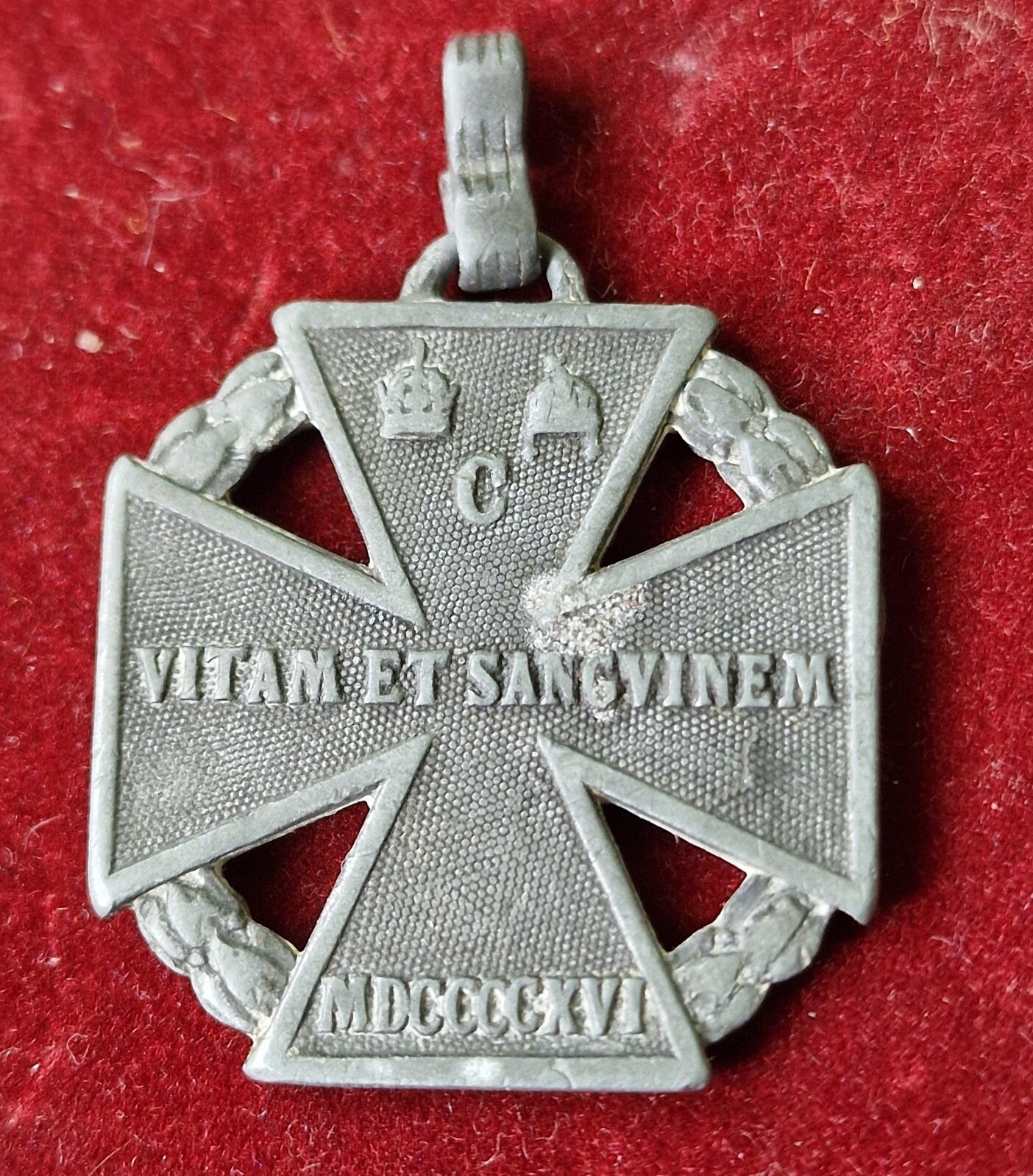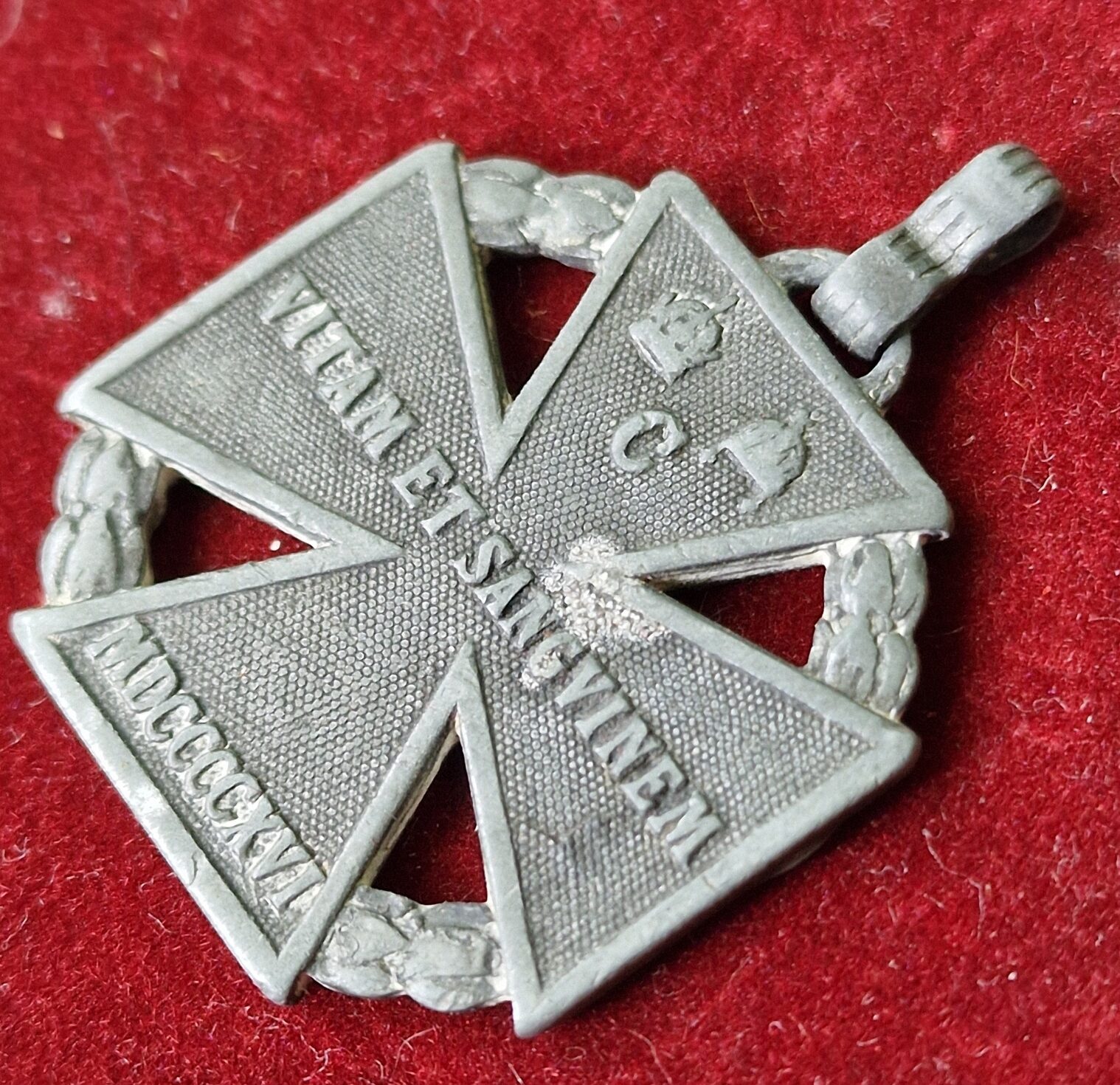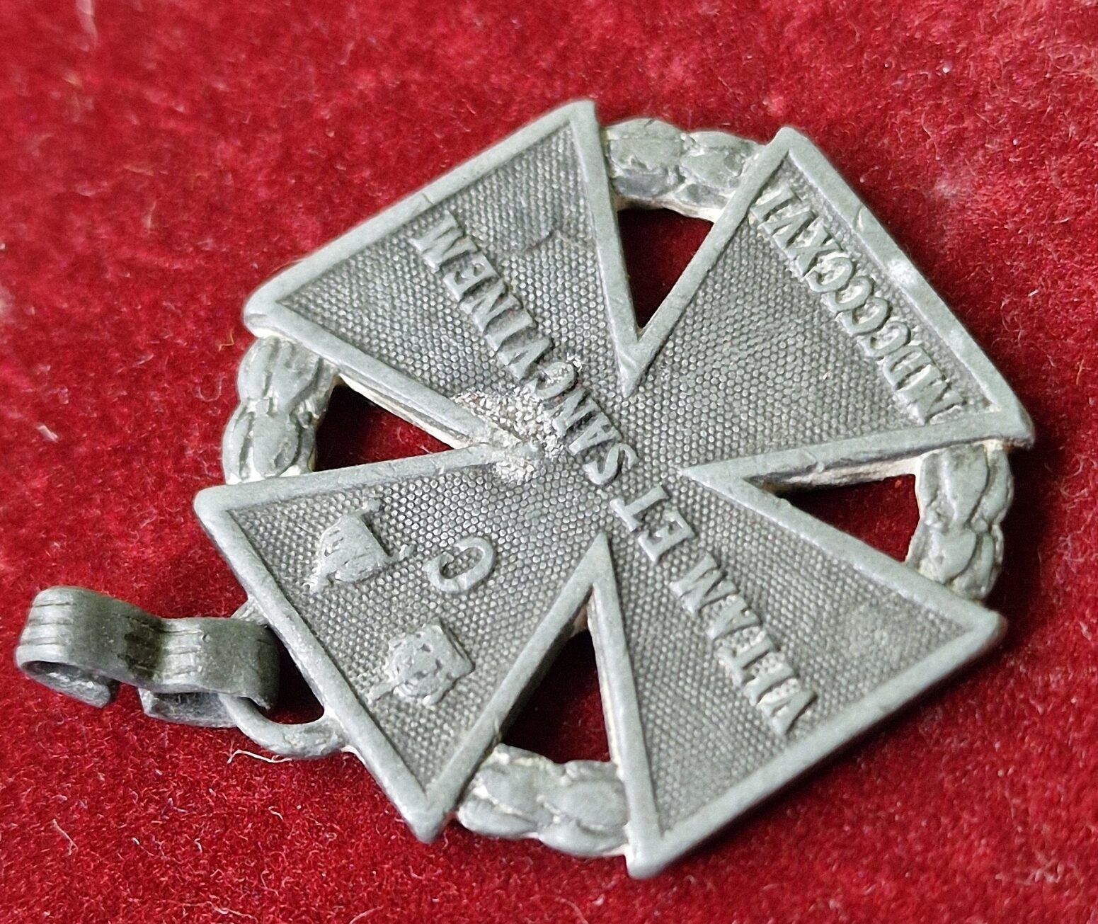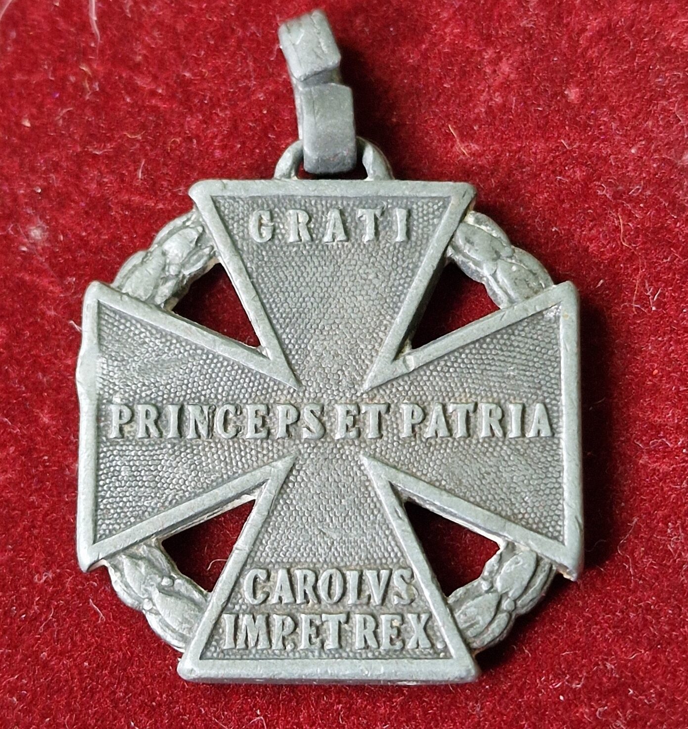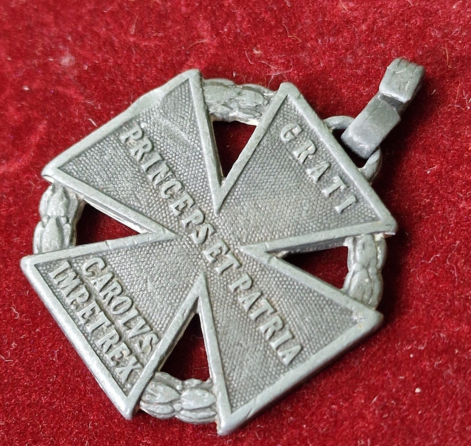 Historické vojenské vyznamenání Karlův kříž z období Rakousko-Uherska s nápisy a symboly na obou stranách.